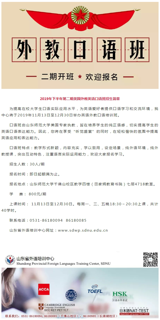 2019年下半年第二期美国外教英语口语班招生简章