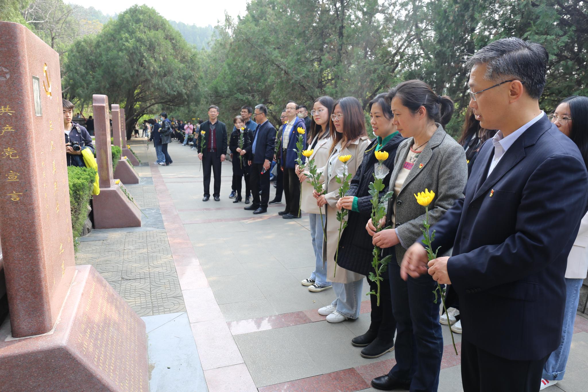 苍松翠柏寄哀思,绿水青山映忠魂。在英雄山清明广场,在直属单位党委副书记颜春杰指挥下,全体师生整齐列队,肃立默哀,向为中华民族伟大复兴和解放事业作出杰出贡献和英勇牺牲的烈士鞠躬致敬。全体党员在直属单位党委副书记李宗刚的带领下面向鲜红的党旗重温入党誓词。全体青年团员在团委书记李莉的带领下面向火红的团旗重温入团誓词。随后,大家列队瞻仰烈士陵园。在王尽美、邓恩铭等烈士墓前,师生们驻足列队,鞠躬默哀,追思英烈的丰功伟绩,向烈士们献花。
