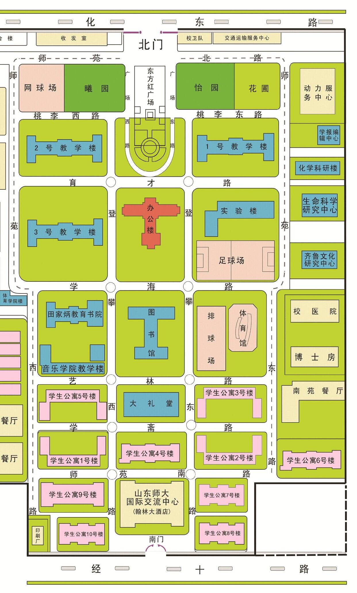 进校入口:请从山东师范大学千佛山校区北门进入学校(济南市历下区文化东路88号)。